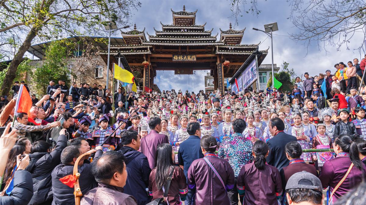 广西三江县梅林镇的苗族人,每年的农历2月2日,俗称龙抬头节,都会举行一场大型的苗族大歌和抢花炮等民俗活动。此图为迎接贵宾进寨,在寨门前设下的迎宾拦路酒的场面。