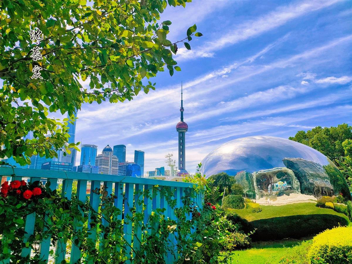 东方明珠广播电视塔高耸入云,其标志性的球体在蓝天白云下熠熠生辉。前景是一片生机盎然的绿意,翠绿的树叶与鲜艳的红玫瑰点缀着蓝色围栏,营造出自然与都市交融的浪漫氛围。右侧一座巨大的镜面球形装置如梦境般反射着周围的景致,将高楼、绿地和天空融为一体,仿佛开启了一扇通往奇幻世界的门户。远处现代化摩天大楼林立,彰显上海作为国际大都市的繁华与活力。整个场景宛如一幅现代与自然和谐共生的画卷,令人流连忘返。