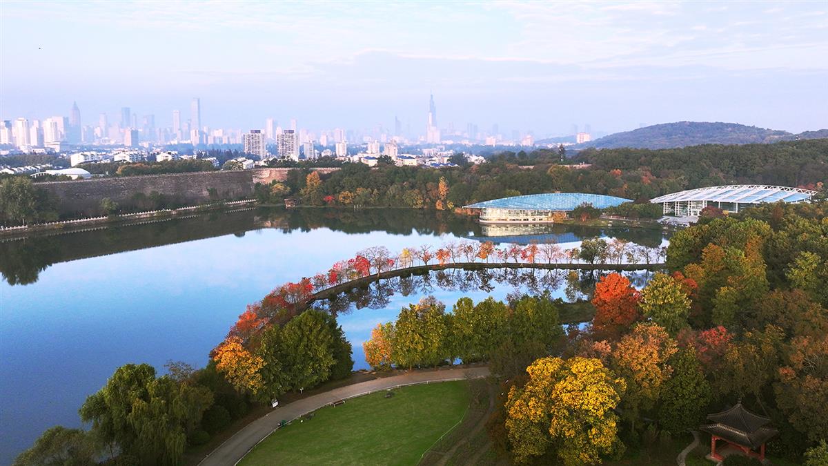 2025年11月13日,摄于南京中山植物园(南园)。近处五彩缤纷的植物园、月牙堤、明城墙与远处的紫峰等城市建筑构成一幅装美的画卷。