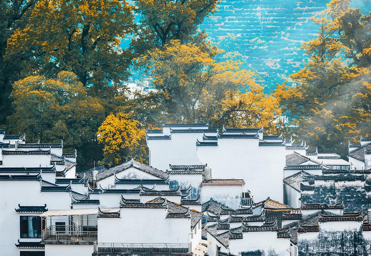 江西婺源石城的秋日景致,?白墙黛瓦的徽派建筑?错落于山谷,?金黄的秋叶?与?墨绿的松柏?交织成画,晨雾中炊烟与山风相拥,尽显古村静谧与诗意。