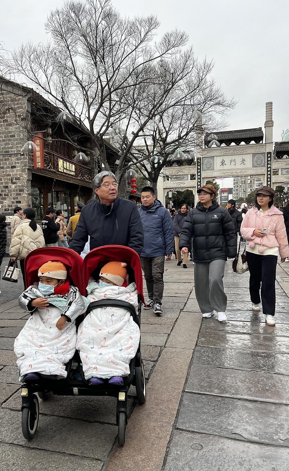 2026年1月10日,摄于南京市老门东街区。老人推着双胞胎婴儿车,带着两宝在老门东街区看风景。
