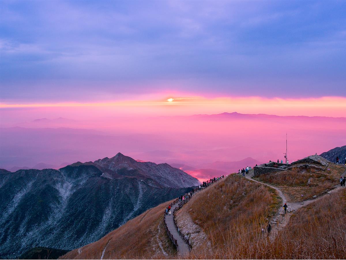 粉紫晨曦漫过山脊,人群踏大地脉搏前行。草摇云转间,邂逅生活的清新与辽阔。