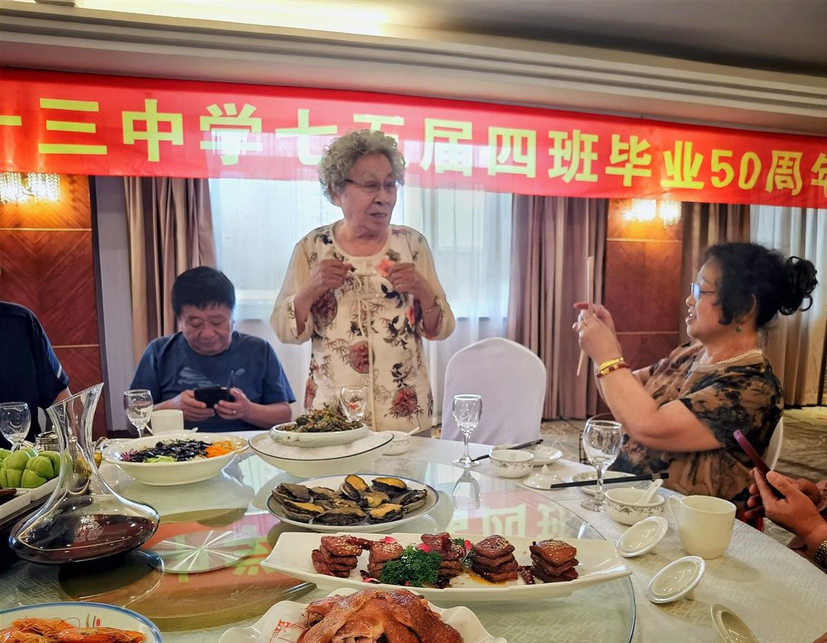 这是2025年7月13日拍于大连的一个毕业五十周年后师生相聚,95岁的班主任依然精神抖擞思维敏捷地发表感言的画面。