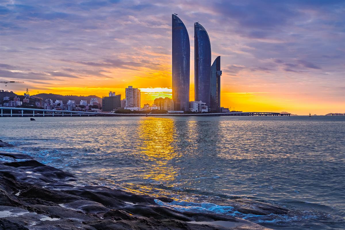 遥望日出的夏门双子楼