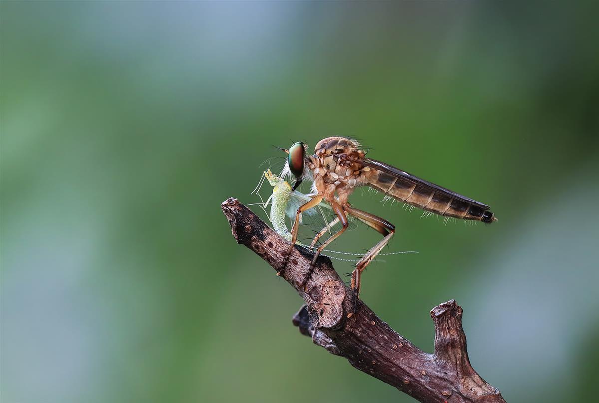 一只食虫虻抓住蜉蝣后正在枝头进食
