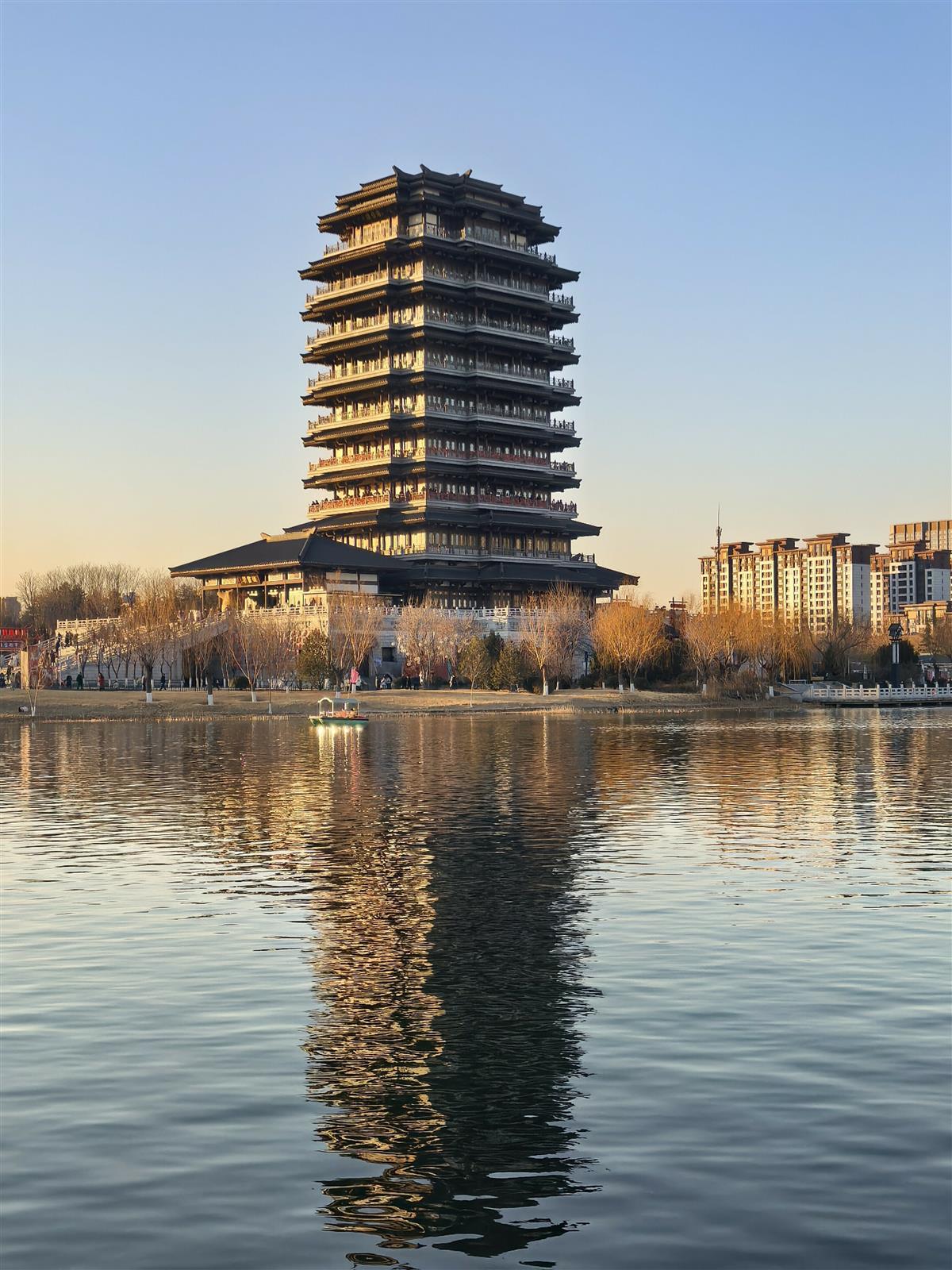 海岱楼在夕照中巍然静立,霞光如千年未散的哲思,轻轻镀亮它的飞檐——仿佛齐风韶韵从未离去,稷下的争鸣声仍随着暮色流淌在每一片砖瓦之间。