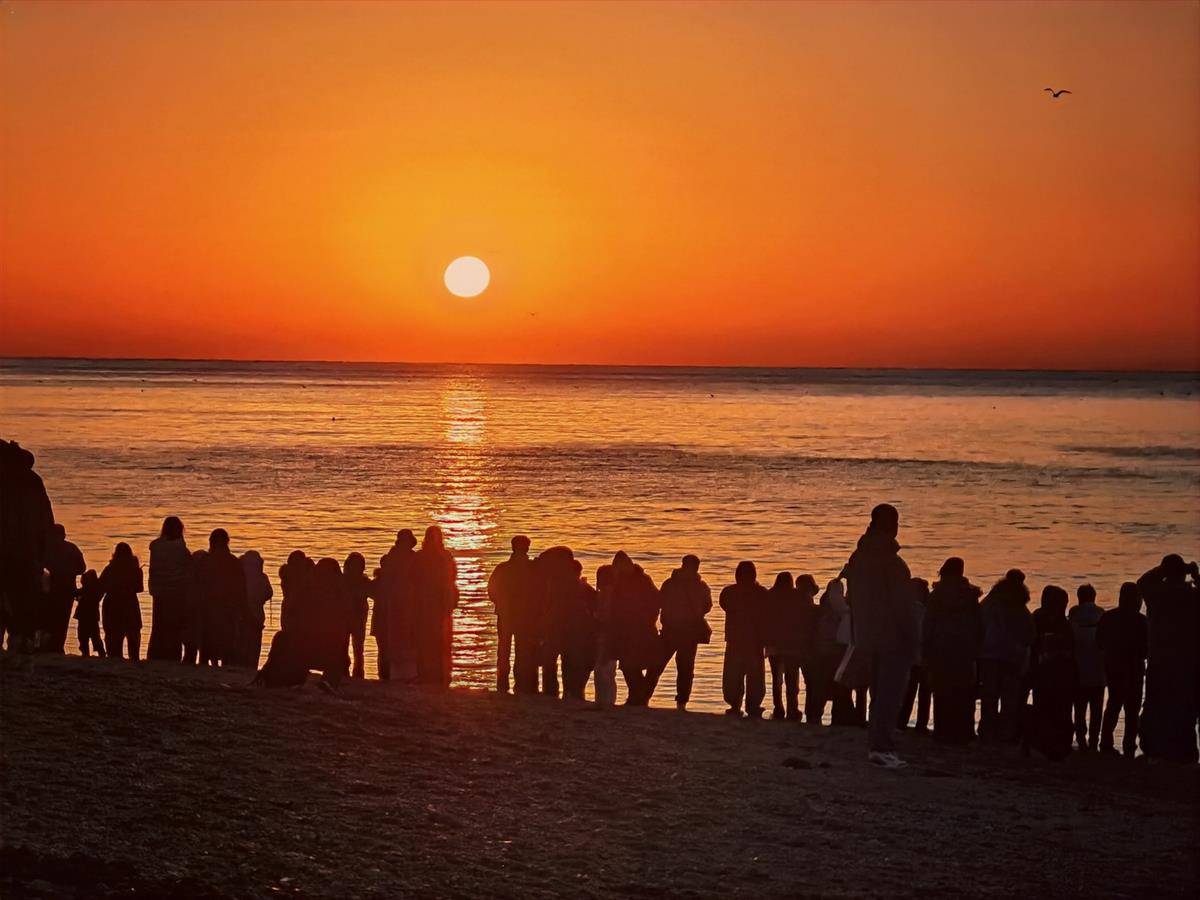 这是元旦的清晨拍于大连海滨的一个人们迎接新年第一轮朝阳画面。