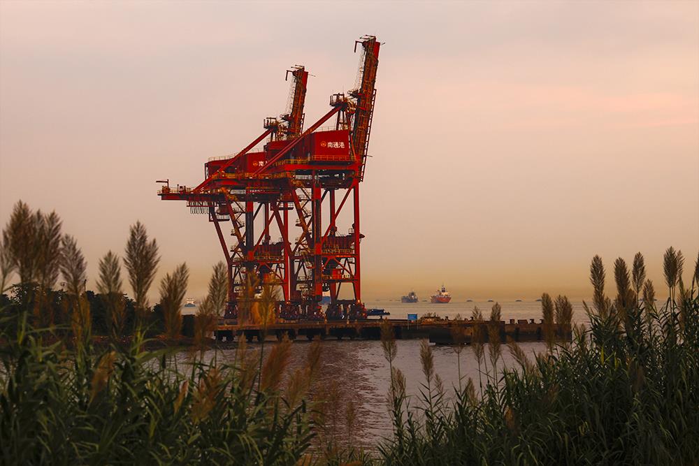 夕阳照在江面上,远处江面轮船穿梭,岸边芦苇飘摇,塔机耸立江边傲然挺立。