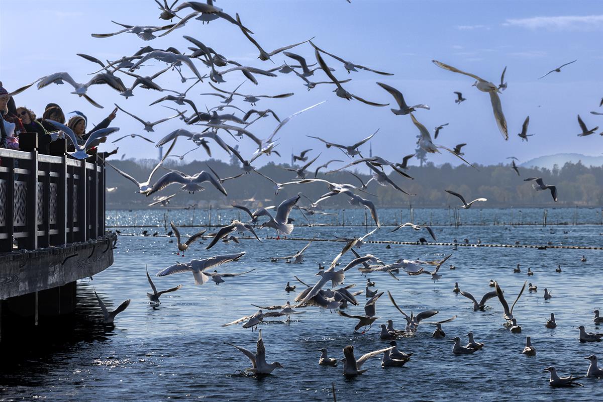 每年的三月下旬,陆续从东北西伯利亚飞越6000多公里,迁徙而来太湖的红嘴鸥,在太湖上捕捉丰富的食物度过寒冷的冬天,吸引大批游客前来观看和鸟儿互动,这说明绿水青山不仅是金山银山,更是万物共生的家园。