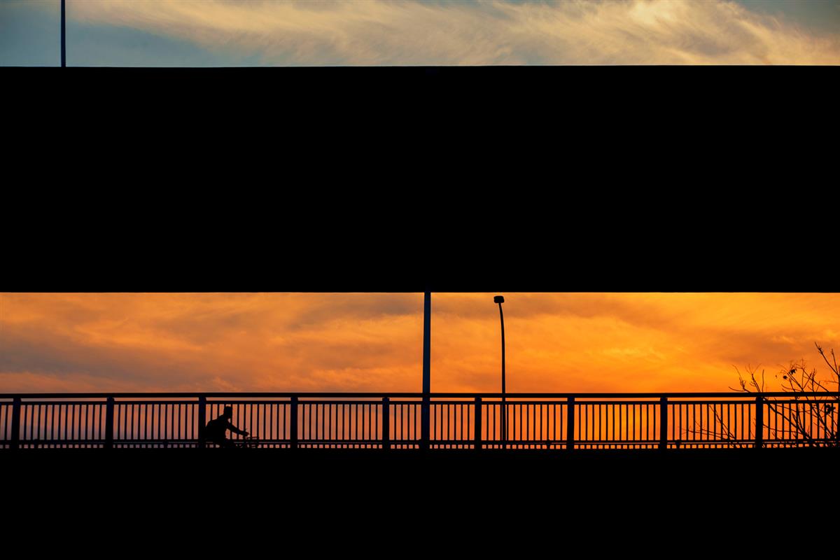 傍晚,行人骑车行使在回家的路上。