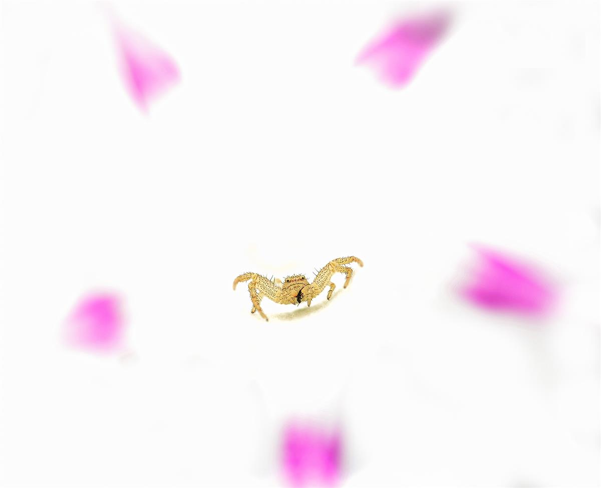 这张照片,以一朵带有粉色斑纹的白色花朵为背景,一只蟹蛛居于花心之处。花朵的形态与色彩营造出一种梦幻氛围,蟹蛛好似在这独特的 “时空场域” 中,完成一场跨越时空的穿行,将小生命的存在与奇幻的时空想象结合,给人以别样的视觉与想象体验。