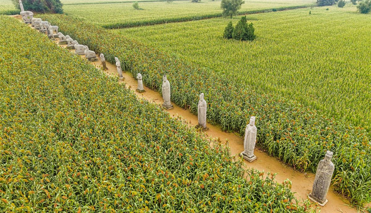 俯拍视角下,古老的石像生队列沿土路静静铺展,石人、石兽的灰白石身,与两侧一望无际的青绿色高粱田形成鲜明对比。历史仪轨的遗迹隐于蓬勃的田野间,厚重的岁月感与鲜活的农耕生机在此交融,仿佛时光在田垄间悄然驻足。