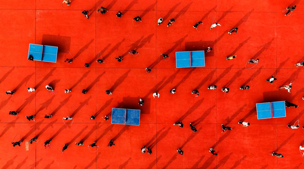 这是一张高空俯拍的照片,鲜艳的橙红色运动场地占据了整个画面。四块蓝色的乒乓球台如同跳动的音符,散落在这片红色的画布上。人们或运动或漫步,在阳光下拉出长长的影子,像灵动的黑色线条,为充满活力的场景增添了生动的韵律,整体画面既有着秩序感,又洋溢着蓬勃的生活气息。
