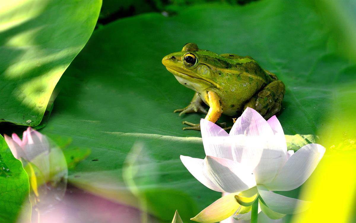 盛夏的荷塘里,一片舒展的翠绿荷叶如温润的绿玉铺展,一只青绿色的青蛙静伏在叶心,明亮的黑眸警惕又灵动,带着泥点的四肢稳稳贴在叶面。粉白的荷花在旁悄然盛放,花瓣晕着浅粉的柔光,阳光穿过叶隙在水面漾出细碎光斑。整幅画面绿意饱满、生机盎然,仿佛下一秒就能听见青蛙振鸣的清脆声响,将夏日荷塘的鲜活与静谧揉在了一起。