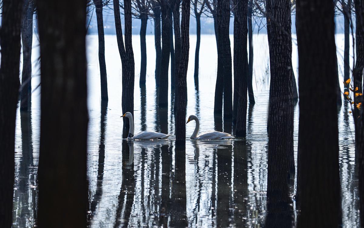 这是一幅空灵静谧的水泽画面,深褐色的枯树干疏密有致地挺立在波光粼粼的湖面上,如同一排排天然的林墙。两只白羽黄喙的天鹅悠然穿梭于树干之间,洁白的身影在深色树干与碎金波光的映衬下格外温柔。阳光穿透林隙,在水面铺展成细碎的光影,整个画面仿佛藏着冬日水泽的童话秘境,静谧又治愈。