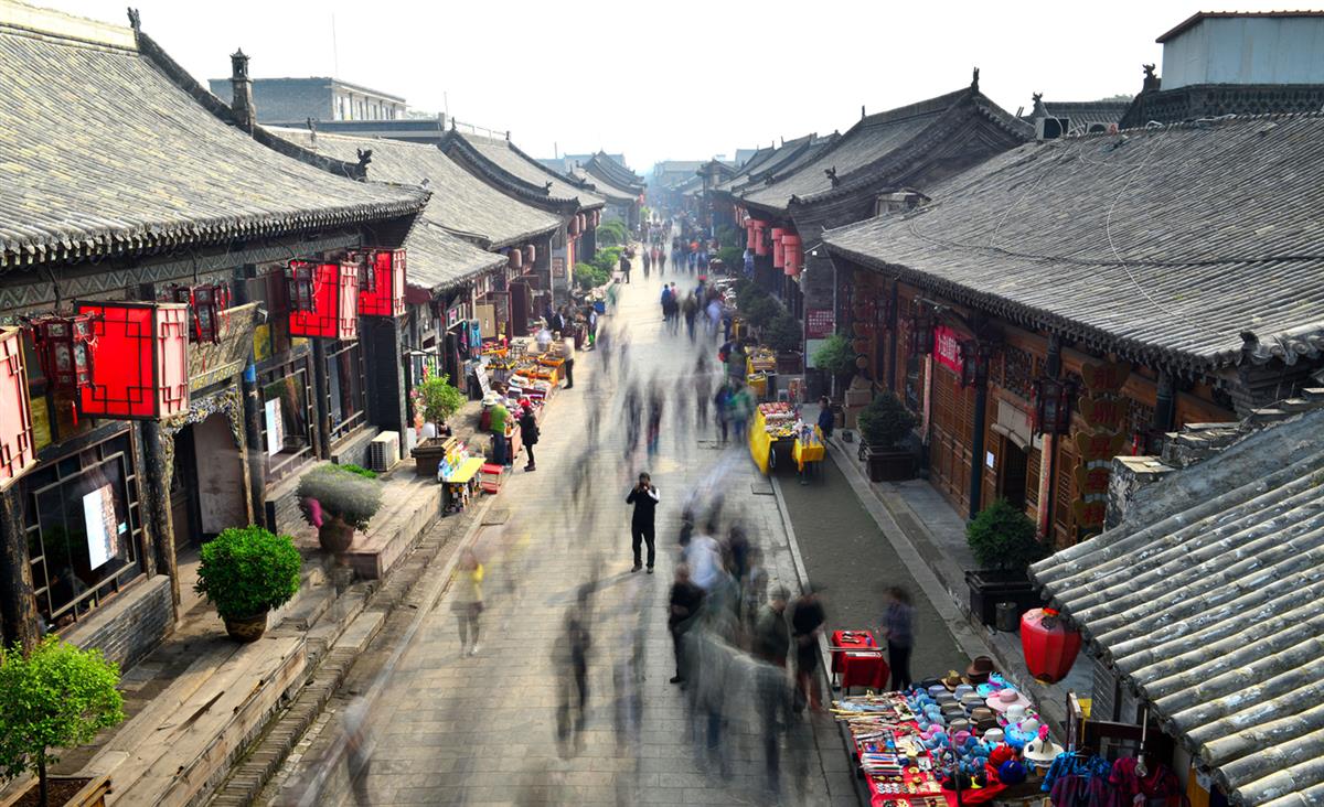 这是一幅俯瞰视角下的平遥古城明清古街景象。两侧是黛瓦灰墙的晋派古建筑,木质门楣上挂着簇簇红灯笼,商铺前摆满了各色特产与手工艺品。石板路上的行人因长曝光呈现出流动的虚影,仿佛将古今的烟火气揉在了一起,既有着千年古城的厚重质感,又洋溢着鲜活的市井活力,整条街道如同一幅流动的历史画卷。