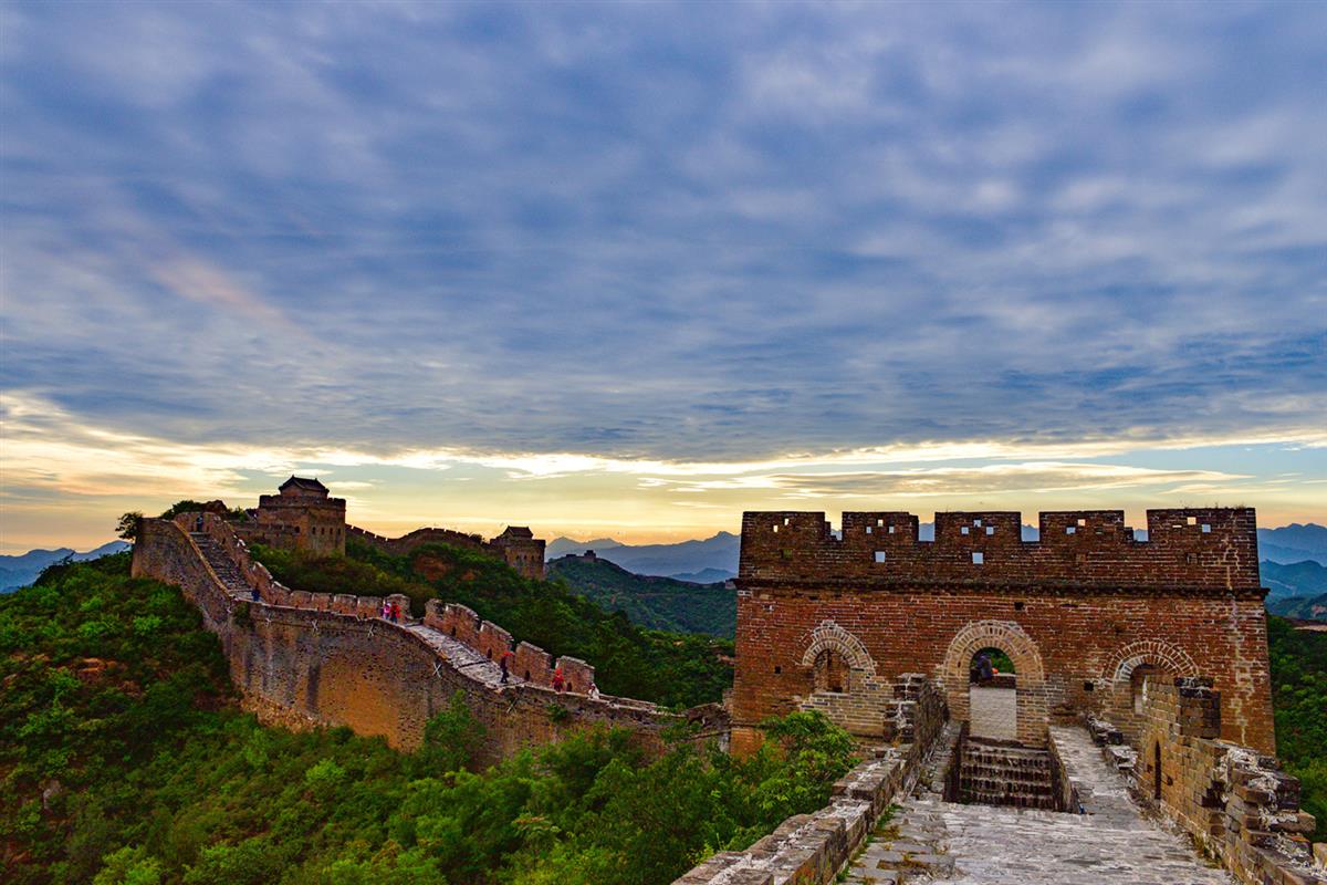 这是一幅壮美的长城暮色图景,古老的砖石敌楼与城墙在翠绿山峦的簇拥下巍然矗立,斑驳的砖纹里藏着千年岁月的痕迹。天际是蓝紫渐变的层叠云絮,被落日晕染出暖黄的金边,霞光穿透云层铺洒在城墙上,让厚重的砖石泛着柔和的暖光。零星游人的身影点缀在城道上,为沧桑的雄关添了鲜活的烟火气,整个画面既有历史的厚重感,又透着山河壮阔的诗意。