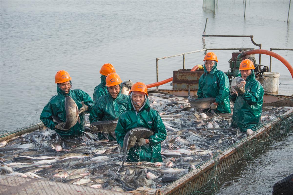 几位渔民身着亮绿色的防水服、头戴醒目的橙色安全帽,站在满载鲜鱼的网箱平台上。他们手里捧着肥硕的大鱼,脸上洋溢着朴实又灿烂的笑容。网箱里的鲜鱼层层叠叠,在波光里翻腾涌动,背景是开阔的水面,整个画面充满了劳作的充实感与收获的喜悦感,把水乡丰收的烟火气展现得淋漓尽致。
