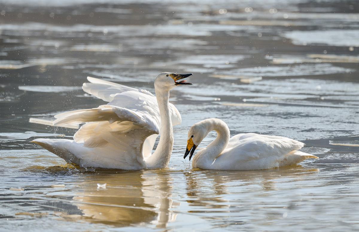 清晨的水面泛着细碎的金光,一只大天鹅正振翅昂首鸣叫,蓬松洁白的羽毛在晨光里舒展,溅起灵动的水花;旁边的天鹅低头轻啄水面,姿态温柔恬静。两只天鹅一唱一和,把湿地清晨的鲜活生机与温柔互动展现得淋漓尽致。
