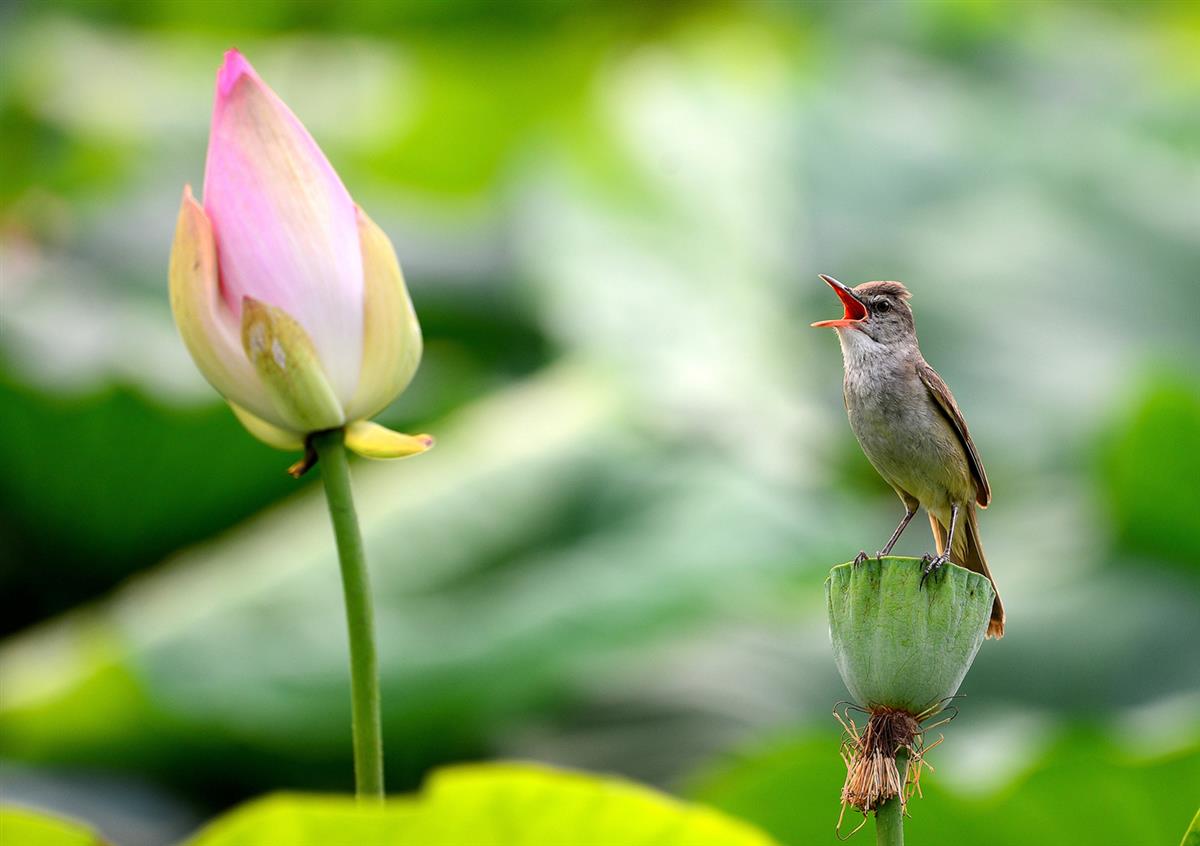 夏日的荷塘里,一只小鸟静立在枯老的莲蓬上,昂首鸣叫,红亮的喙部格外醒目。旁边粉白渐变的荷花苞饱满挺立,在层层叠叠的翠绿荷叶映衬下,整个画面充满了鲜活的夏日生机,把鸟鸣荷静的灵动诗意展现得淋漓尽致。