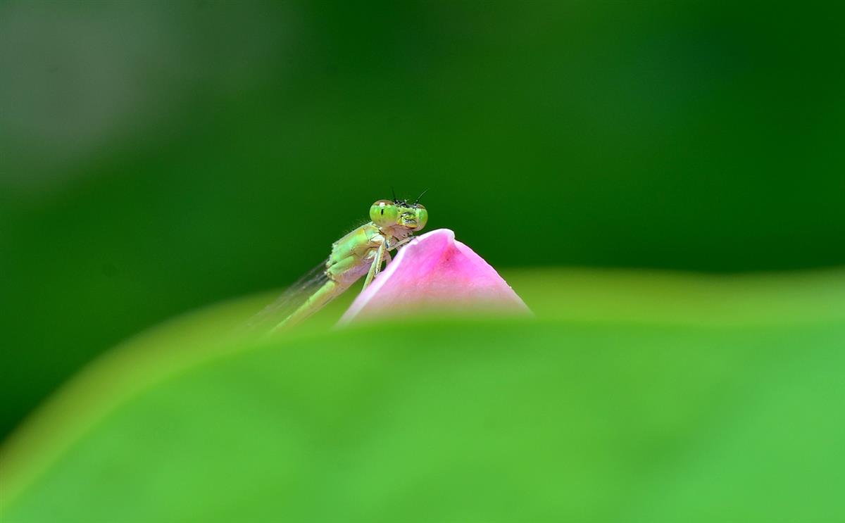 夏日荷塘的微观特写里,一只通体翠绿的豆娘静栖在粉嫩的荷瓣尖端,黑亮的复眼带着灵动的光泽,纤细的足爪轻贴花瓣。背景是大片柔和的翠绿荷叶,整个画面充满了清新的夏日生机,把微观世界的静谧与美好展现得淋漓尽致。