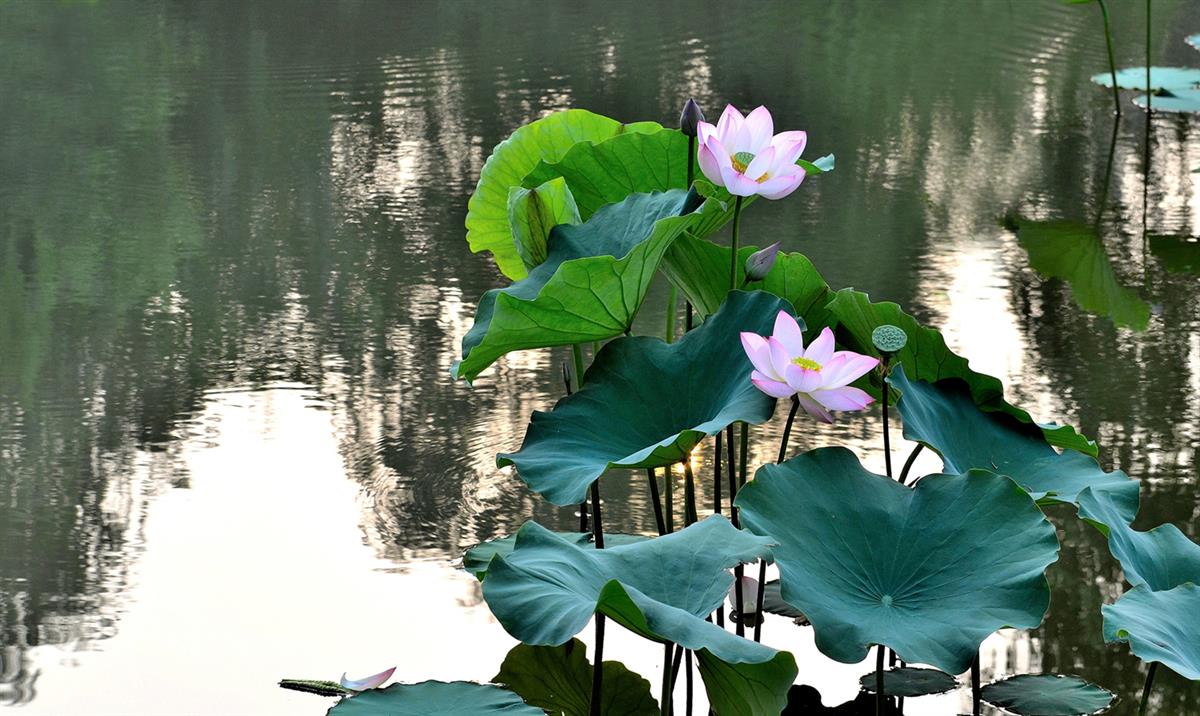 静谧的塘面如温润的镜面,泛着柔和的天光倒影。层层叠叠的翠绿荷叶间,两朵粉白渐变的荷花清雅绽放,花瓣舒展、花蕊明黄,在朦胧的水色里透着夏日独有的宁静与诗意,把荷塘的雅致生机展现得淋漓尽致。