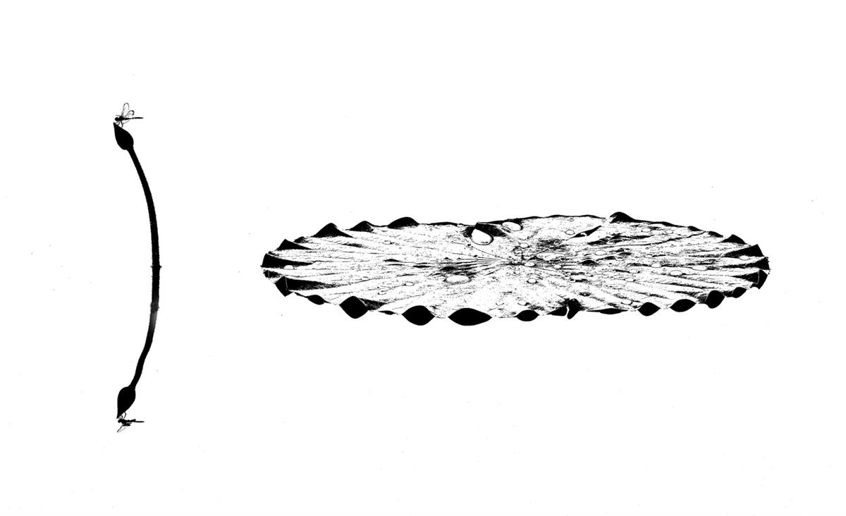 这是一幅极简的黑白艺术作品,以纯白为底,左侧是一根线条弯曲的荷梗,带着纤细的细节;右侧是一片轮廓呈波浪状的荷叶,表面纹理如晕染的墨纹,清晰可见叶脉的肌理。整体风格素雅空灵,宛如一幅写意水墨画,把荷的清雅风骨以极简的黑白语言展现得淋漓尽致。