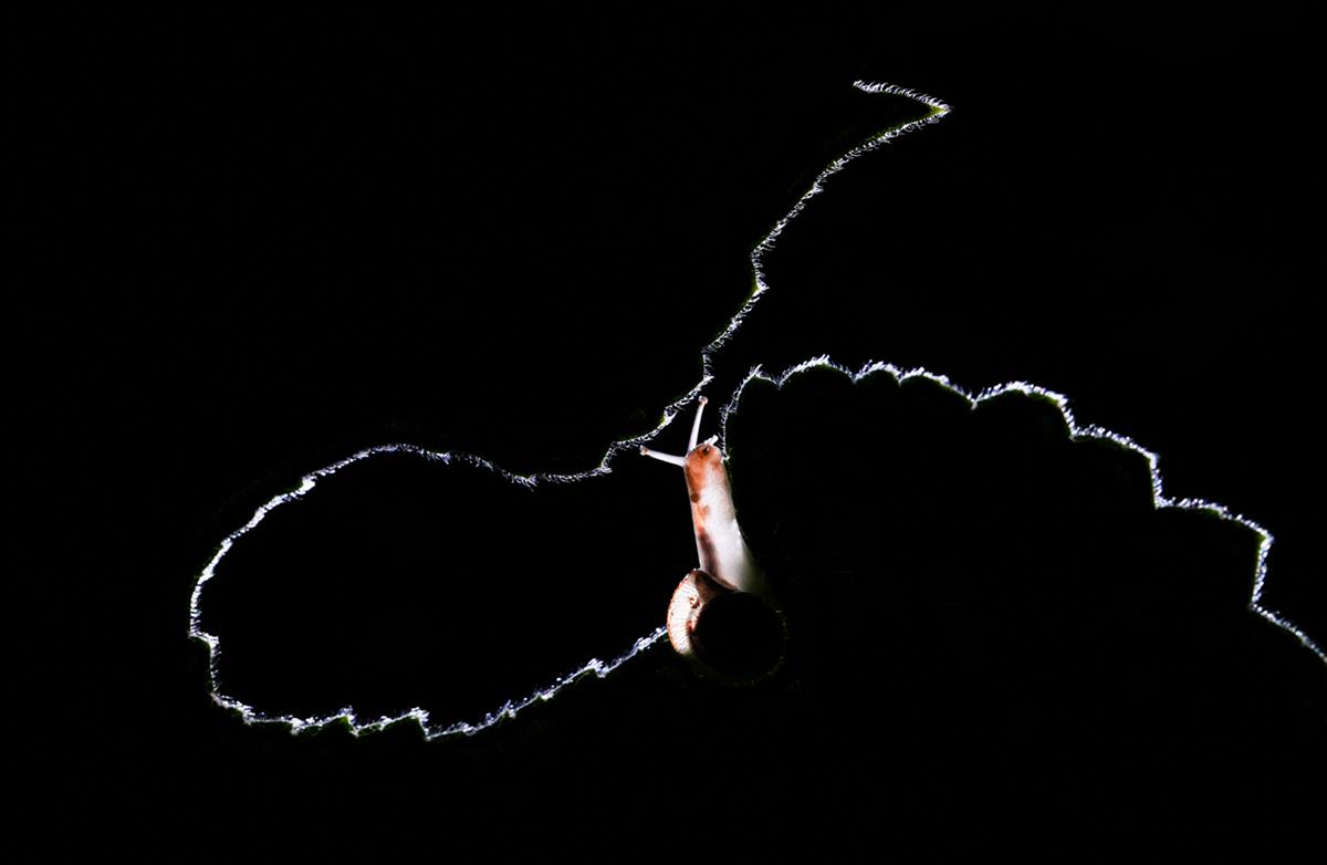 纯黑背景中,一道带着细碎发光白边的裂隙蜿蜒延展,一只蜗牛正沿着裂隙边缘缓缓爬行。它的躯体在暗夜里格外醒目,仿佛是在幽暗缝隙中探寻微光的行者,画面静谧又充满探索的诗意。