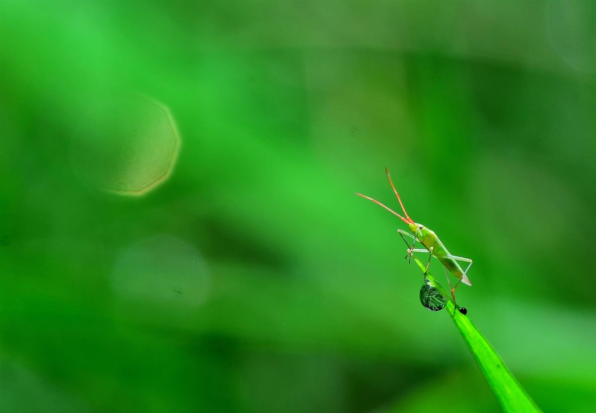 在一片清新的嫩绿草叶尖端,一只体色翠绿的小虫(如稻棘缘蝽)静静停留,橙红色的细长触角格外醒目。草叶上悬着一颗晶莹的露珠,映着周遭的绿意光斑,背景是朦胧的翠绿底色,整体营造出夏日清晨微观世界的静谧与灵动。