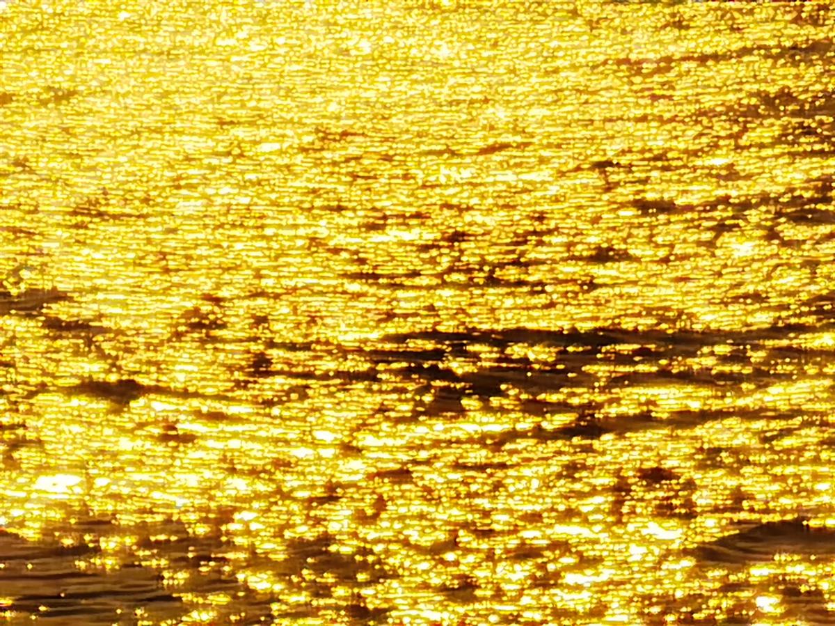 夕阳西下,阳光照在海面上,海水仿佛点成金子,瞬间变成一片金色的海洋,无与伦比!像天神点海成金!