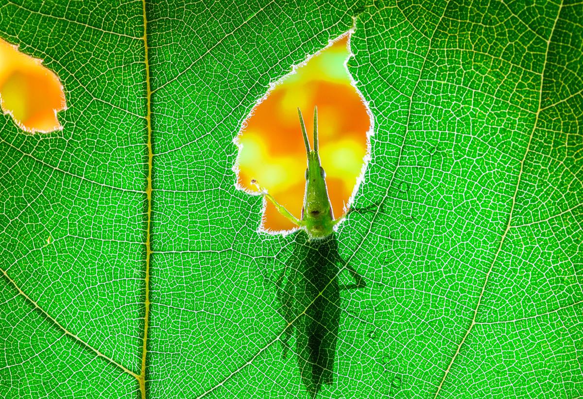 蚱蜢从叶片破洞探出身子,仿若在绿光世界里执行侦察任务的小兵,充满童趣与自然生机,展现微观生命的灵动。