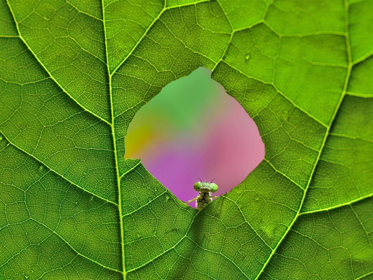 这是一幅充满童趣的微观创意作品。一片脉络清晰的鲜绿叶片占据了画面主体,中央的不规则孔洞打破了绿意的完整,露出后方粉绿渐变的柔和彩光。一只小巧的螳螂正从洞口探出头,圆溜溜的复眼满是好奇,仿佛在悄悄观察着叶片外的世界。叶片细腻的纹理与梦幻的背景色彩形成有趣对比,让这个微小的窥探瞬间充满了治愈感与童话般的氛围。