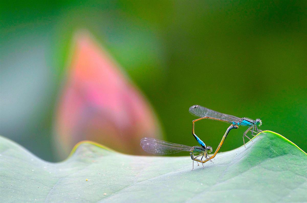 这是一幅充满诗意的微距生态摄影作品,画面聚焦于两只轻盈的豆娘。它们有着蓝黑相间的纤细躯体,翅翼通透如纱,正亲昵地停驻在一片翠绿色的叶片上,姿态仿佛在进行一场温柔的互动。背景是朦胧的绿粉渐变,柔和的色调让整个场景更显静谧清新,细腻地展现了自然微观世界里的灵动与浪漫。