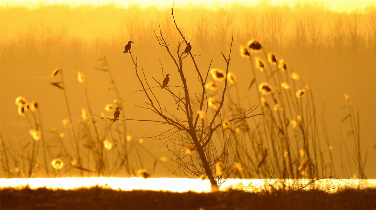 暖金色的夕阳将天地晕染成柔和的橙黄,一株枯树的剪影伫立在画面中央,几只小鸟悠然停栖在枝桠间,周围的芦苇剪影在光晕里舒展。下方的水面泛着粼粼金光,与暖调的郊野融为一体,营造出静谧治愈的黄昏诗意,尽显自然里的闲适与温柔。