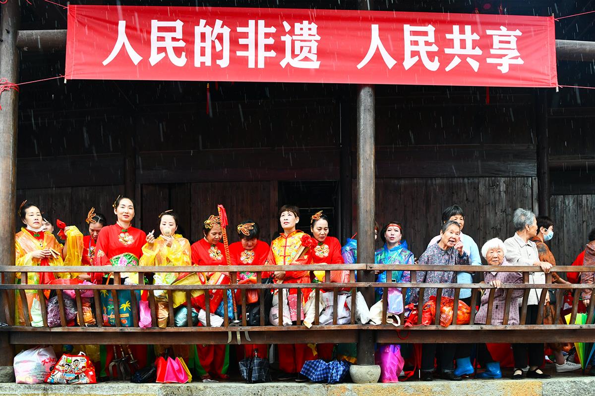 2023年11月29日,浙江省永康市芝英镇举办非遗节目表演,百姓在观赏节目上。演员与观众在古镇半面街上看戏,表情生动。