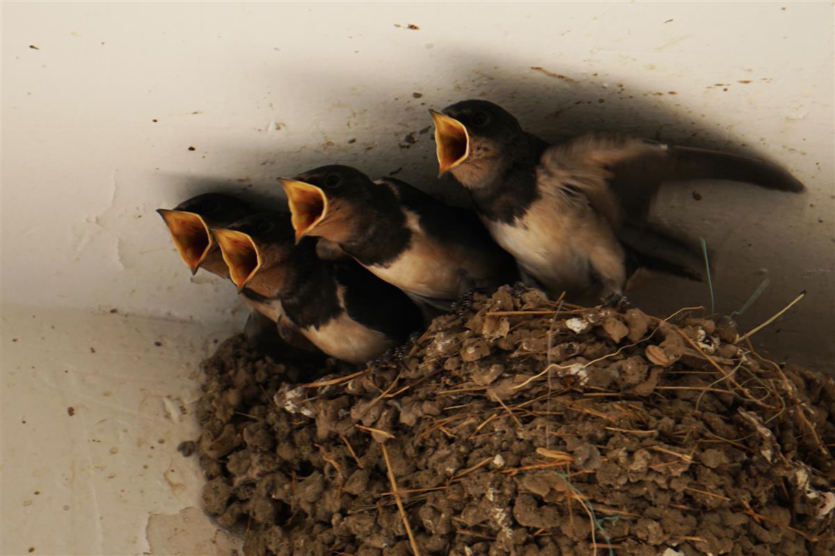 正是燕子哺育宝宝的时节,燕子妈妈飞来,四只嗷嗷待哺的小燕子都张开大嘴等着妈妈喂食。
