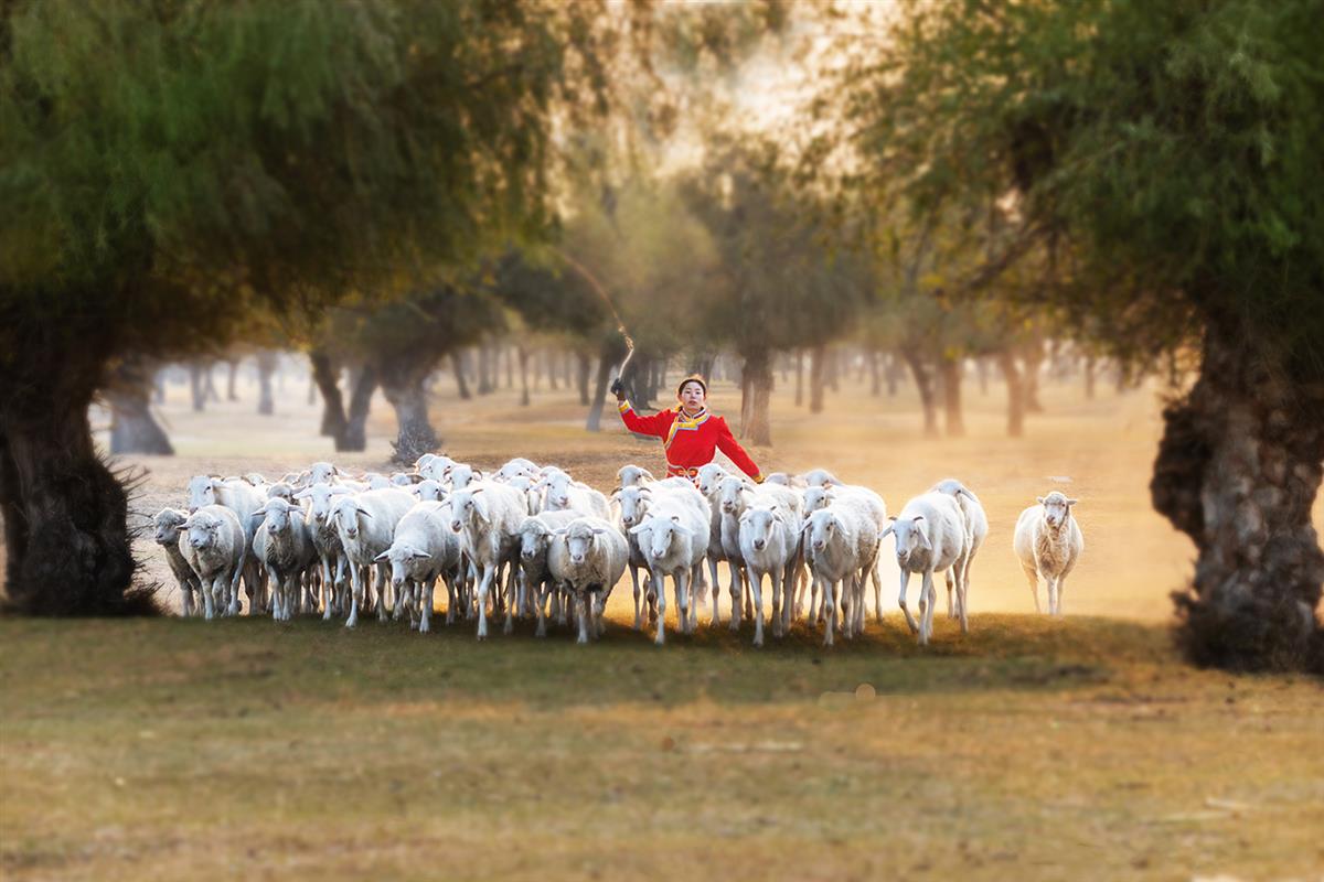 2025年10月14日拍摄于内蒙奈曼旗,清晨牧羊女在晨光中赶着洁白的羊群走来。