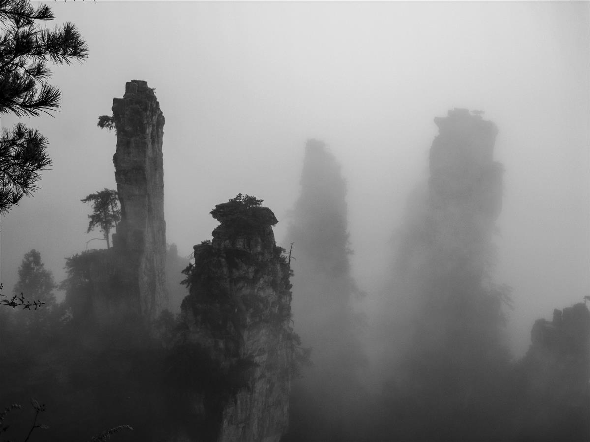 照片拍摄于张家界武陵源景区。云雾弥漫,为这奇景蒙上了一层愈发浓郁的缥缈与神秘面纱。照片通过对云雾和峰林的精心布局,巧妙地引导观者视线,展现出峰林的壮美风姿与丰富层次感。以黑白灰的色调呈现,简洁却又和谐统一,进一步强化了画面静谧、清幽的氛围。