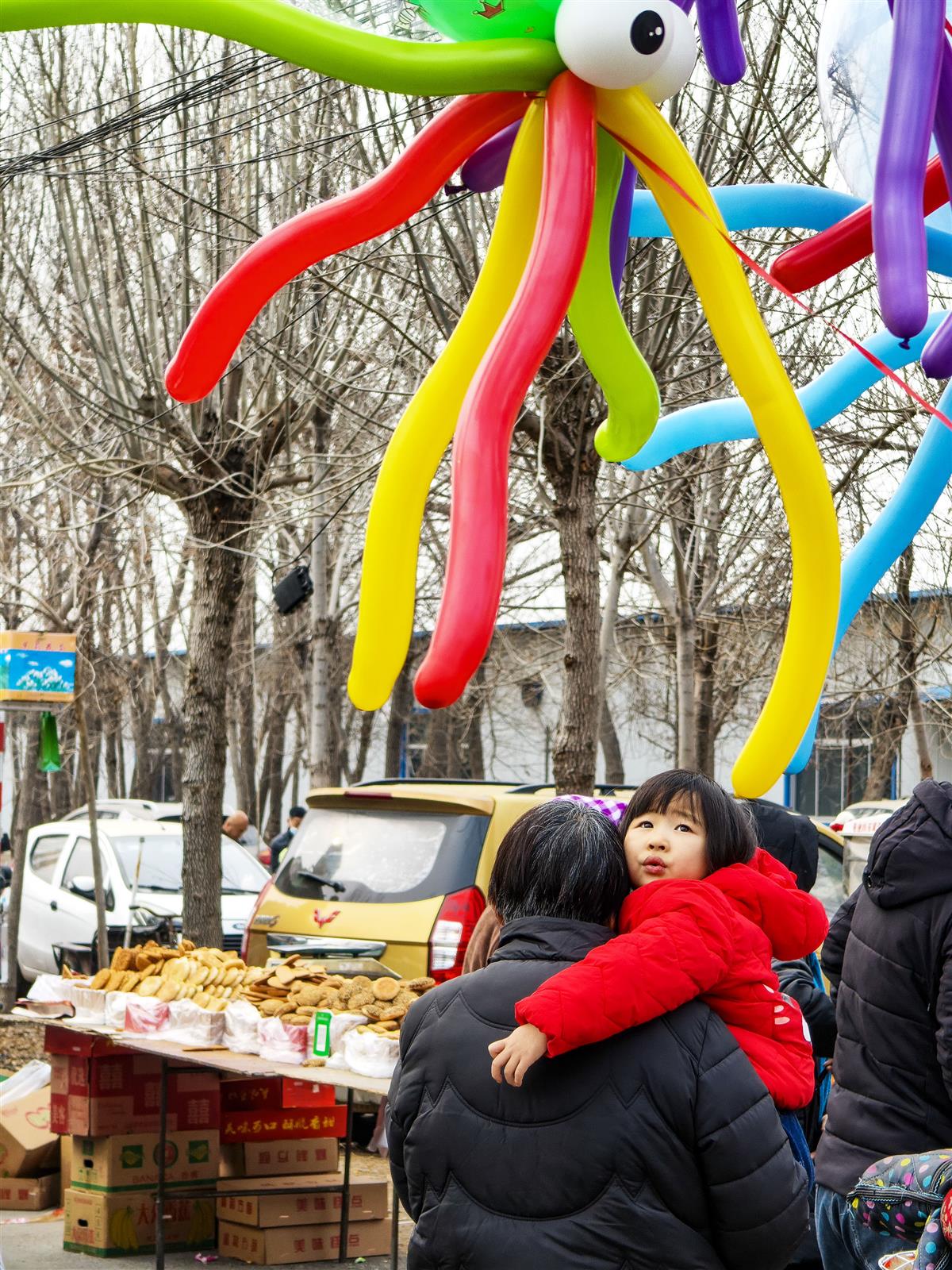 拍摄于山东省惠民县刘安庄大集,一个小女孩被眼前飘舞的气球或是什么东西所吸引,露出渴望的眼神。最动人的童趣,就藏在这平凡的集市里。