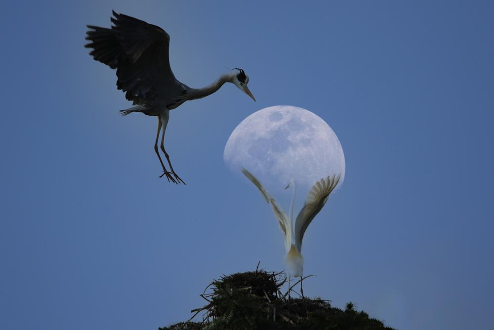 苍鹭振翅的剪影向着悬于天际的明月俯冲而去,姿态恰似传说中奔赴月宫的仙禽。深蓝的天色为底,圆月与飞鸟的轮廓相映成趣,营造出静谧又充满浪漫想象的氛围,仿佛将古老神话里的“奔月”场景,定格在了自然瞬间里。