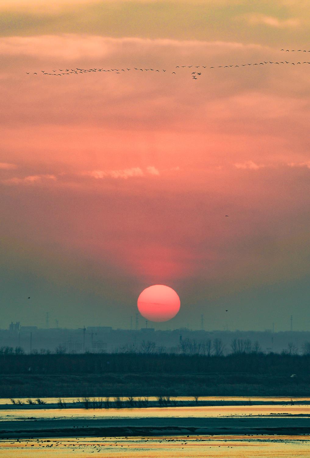 一轮浑圆的橙红落日悬于天际,粉橙、暖红与青灰的云霞层层晕染,铺展成辽阔温柔的黄昏底色。归雁列阵悠然掠过暖调的天空,下方的水岸在落日余晖里漾着柔润的光色,整体既带着黄昏独有的静谧暖意,又藏着候鸟迁徙的诗意奔赴感。