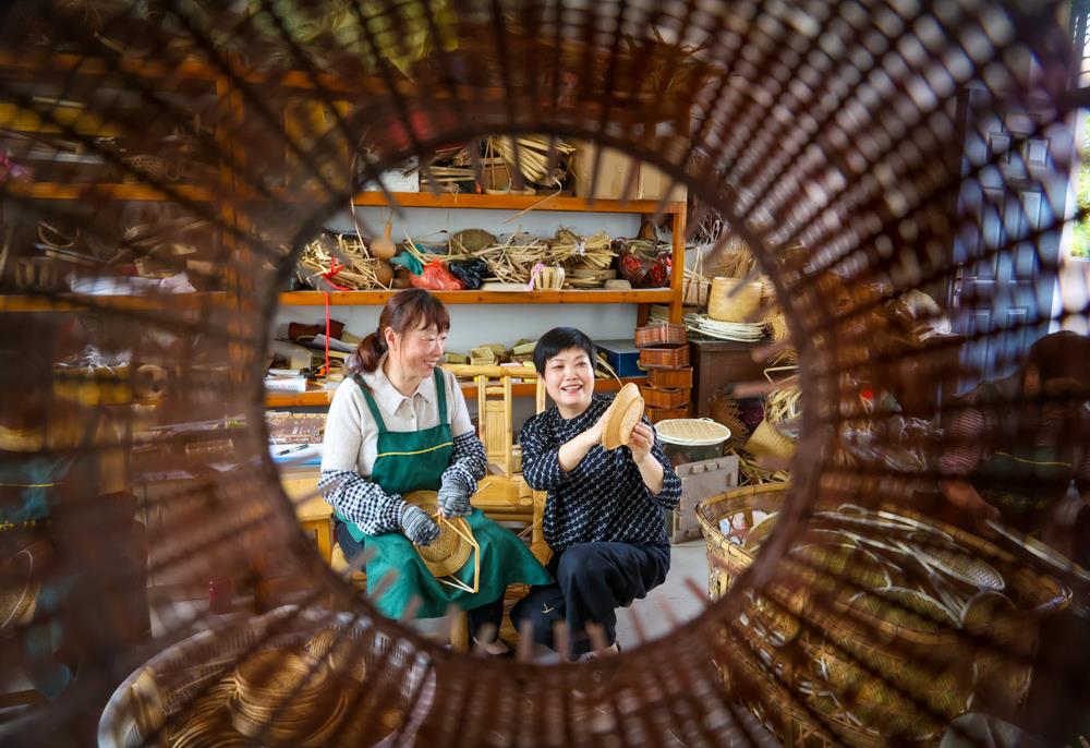 透过竹编器具的圆形孔洞,两位手艺人的身影被温柔框住,暖黄的光线里,竹篾在指尖流转,笑容在脸上舒展。这个视角既像透过时光的孔洞,窥见传统手艺的鲜活日常,也暗合了“烟火气”的温暖内核——竹编不仅是谋生的技艺,更是藏在指尖、融在笑里的生活温度。