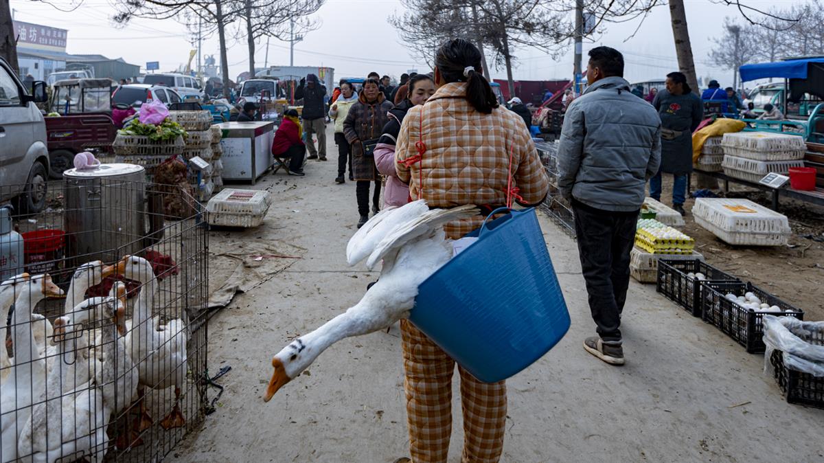 春节马上到了,洧川镇有春节炖大鹅的民俗,刘女士赶集买了只大鹅准备过大年炖大鹅,大鹅恋恋不舍同伴,如同生死离别。