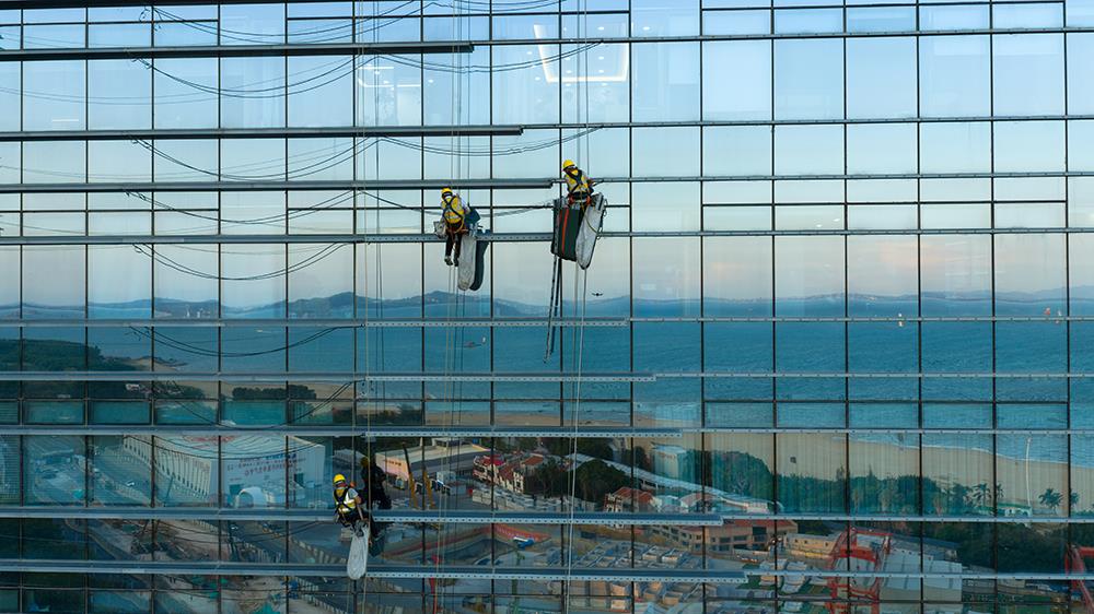 这张照片定格了厦门高空幕墙清洁的瞬间。三位“城市蜘蛛人”悬挂在摩天大楼的玻璃幕墙上,脚下是蔚蓝的海面与环岛路的城市风光。透明的玻璃将天空、大海与城市景致层层叠叠地映在一起,而他们的身影则为这幅静美的城市画卷,增添了一份充满力量感的生动注脚。