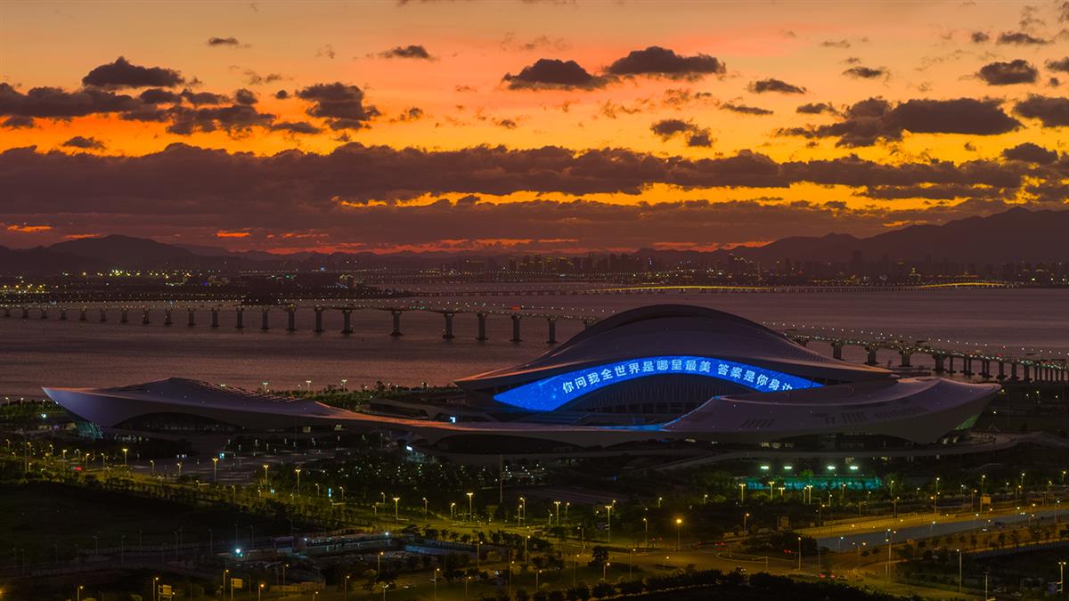 这是厦门海峡文化艺术中心的黄昏时刻,橙红色的晚霞在天空铺展,跨海大桥如银链般延伸向远方。艺术中心的穹顶亮起蓝色灯光,滚动着浪漫的歌词,与海面粼粼波光、城市万家灯火交织成一幅温柔的城市画卷。古老的海湾与现代的建筑在此刻共鸣,让厦门的夜既有晚霞的炽热,也有诗句的浪漫。