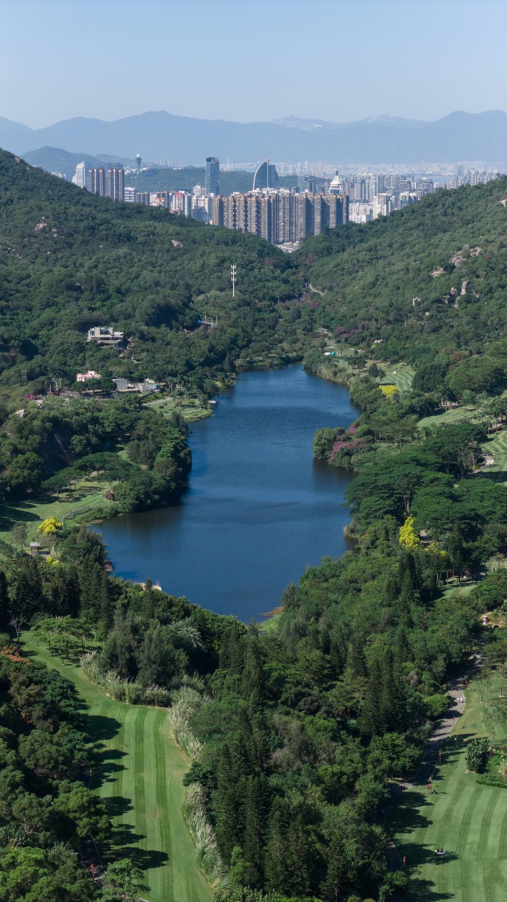 这是一幅厦门城市与自然交织的俯瞰画卷。镜头里,翡翠色的山林环抱着一汪幽蓝的湖水,湖畔是修剪齐整的茵茵草坪。远处的摩天楼群在山峦间若隐若现,繁华都市与静谧湖山在此无缝衔接,生动诠释了厦门“山海连城”的独特城市肌理。