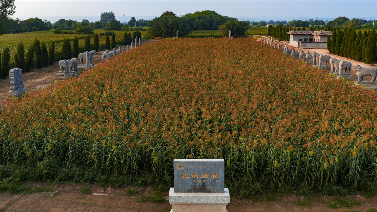 宋陵神道种的高梁熟了,皇帝和石像生守望着这丰收的景象
