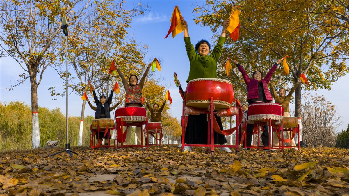 袁坊村自发组建了一只女子盘鼓队,农活休息时,在田间地头敲鼓取乐放松身心