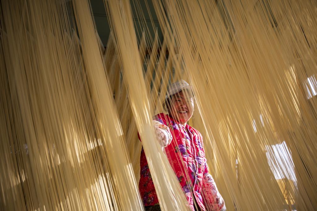 垂挂的挂面在光影下泛着暖黄光泽,如金丝交织成帘。面条纺织工的身影在面丝间若隐若现,一抹笑意让充满质感的劳作场景多了一份鲜活的温度,定格了皖西传统手艺里的人文暖意。