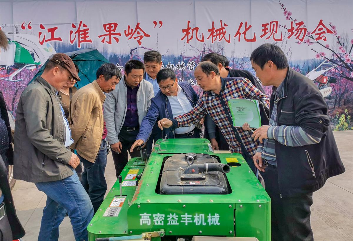 在“江淮果岭”的田间课堂里,大家围着农机仔细观摩、互动交流,这一场景不仅是技术推广的现场,更是乡村产业升级的生动缩影,体现了新农具、新技术为传统果业带来的新活力。